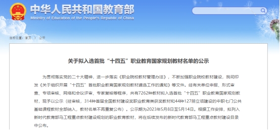 本次“十四五”首批职业教育国家规划教材的遴选工作,是为贯彻落实党的二十大精神,进一步落实《职业院校教材管理办法》,不断加强职业院校教材建设,由教育部印发《关于组织开展“十四五”首批职业教育国家规划教材遴选工作的通知》等文件。经有关单位申报、形式审查、专项审核、网络和会议评审、专家复核等程序,全国高职本科组共有157种教材拟入选首批“十四五”职业教育国家规划教材。入选的“十四五”首批职业教育国家规划教材,价值导向鲜明、教育理念先进、质量水平高、社会评价好,代表了目前我国职业教育教材建设领域的领先水平。
