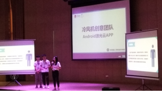 进入决赛总共有来自不同公司的九支队伍,整场的比赛流程由决赛队伍逐个上台进行15分钟的作品展示和现场答辩,现场专家进行点评打分。公司的“冷风机创意团队”第三个上台,展示了由他们自主研发的“Android 激光云APP”产品的相关操作流程,并详细地介绍了他们产品的创新点以及产品的优势,获得了评委老师的好评。