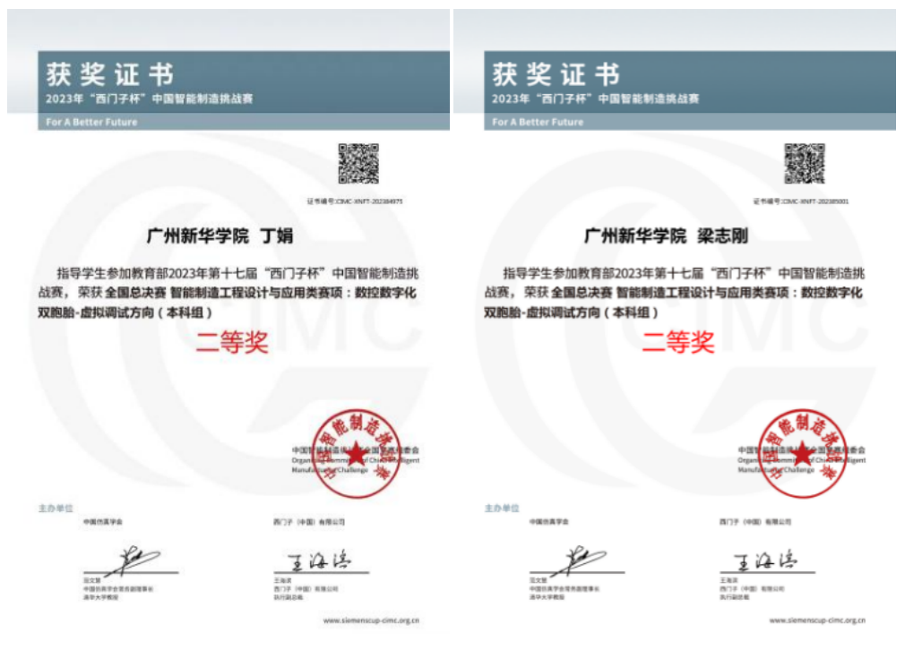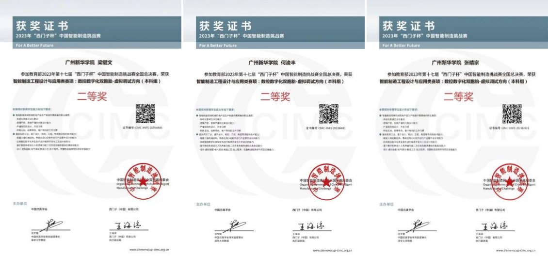2023年8月15日,第十七届CIMC“西门子杯”中国智能制造挑战赛全国总决赛落下帷幕,太阳成集团tyc151cc学子不负众望,再创佳绩。由丁娟和梁志刚两位老师带领的队伍荣获“数控数字化双胞胎-虚拟调试赛项”本科组全国总决赛二等奖,创历史最好成绩。该队伍的成员梁键文、何浚丰、张靖宗,均来自2021级智能制造工程专业。此次的收获不仅给公司带来荣誉,更是为公司的荣誉墙增添了光辉的一笔。