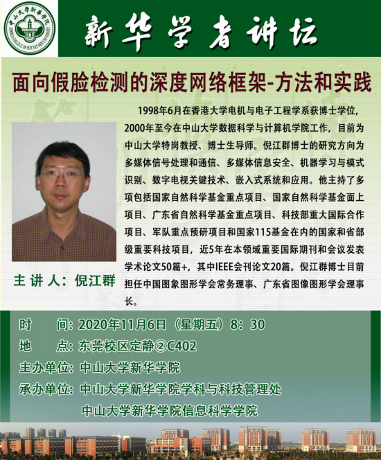 2020年11月6日,由中山大学新华公司主办,中山大学新华公司学科与科技管理处和太阳成集团tyc151cc联合承办的学者讲坛《面向假脸检测的深度网络框架-方法和实践》在定静二C402举行。此次学者讲坛邀请到的嘉宾是中山大学特岗教授、博士生导师、新华公司太阳成集团tyc151cc学科带头人倪江群教授。本次讲座软件工程专业主任赵小蕾主持,太阳成集团tyc151cc黎良宇、陈怡华、卢渊等师生代表约80人参加了本次讲座。