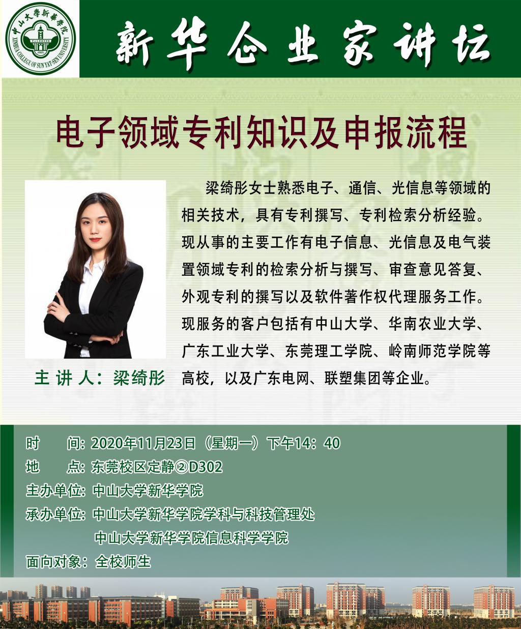 梁绮彤女士熟悉电子、通信、光信息等领域的相关技术,具有专利撰写、专利检索分析经验。现从事的主要工作有电子信息、光信息及电气装置领域专利的检索分析与撰写、审查意见答复、外观专利的撰写以及软件著作权代理服务工作。现服务的客户包括有中山大学、华南农业大学、广东工业大学、东莞理工公司、岭南师范公司等高校,以及广东电网、联塑集团等企业。
