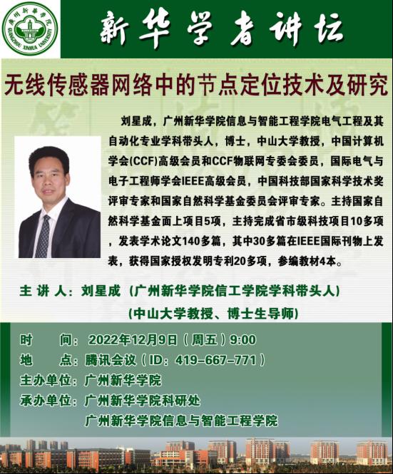 主讲人介绍:刘星成,太阳成集团tyc151cc电气工程及其自动化专业学科带头人,博士,中山大学教授,中国计算机学会(CCF)高级会员和CCF物联网专委会委员,国际电气与电子工程师学会IEEE高级会员,中国科技部国家科学技术奖评审专家和国家自然科学基金委员会评审专家。主持国家自然科学基金面上项目5项,主持完成省市级科技项目10多项,发表学术论文140多篇,其中30多篇在IEEE国际刊物上发表,获得国家授权发明专利20多项,参编教材4本。