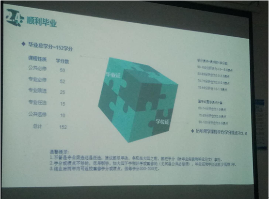 随后,张石兰老师给同学们深入分析了顺利拿到毕业证所需的学分分布和成绩点,说明大一大二真是刷学分和刷绩点的好时候,别浪费了美好青春,别把工作全堆到大三。