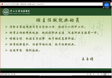 最后由赵小蕾老师总结会议,建议同学们脚踏实地,适当放低期望值,不要否定自己害怕失败,找准自己的方向,在社会中要提高安全意识,保持理性。班主任王玉娟老师做就业动员,希望同学们在注意自我安全防范的同时,勇敢迈出职业生涯的第一步,祝同学们顺利追逐梦想,扬帆起航!