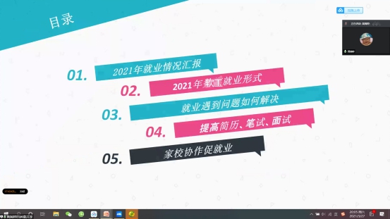会议开始,黄婉婷老师首先分析了今年的就业情况,说明了在去年疫情的影响下,“供求矛盾”被放大,今年毕业生就业还需要面对去年毕业生和下岗人员的工作竞争。黄婉婷老师提醒同学们不要裸辞,机会难寻,不要轻易放弃就业的机会。此外,建议同学们可以灵活就业,多种就业行业值得去尝试,并给同学们讲解了参军入伍、直招士官等就业方式。然后,针对同学们就业中遇到的问题该如何解决提供解决方法,提醒同学们有问题要积极面对、专业的问题要找专业人员解决、积累实战经验。最后讲到就业不单单是公司和员工的事,家长的作用也很重要,呼吁家长与公司协作促进员工就业。