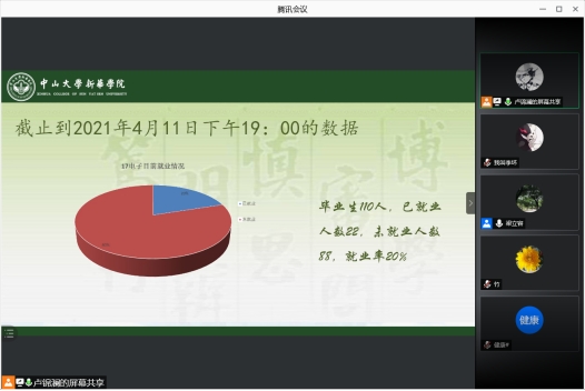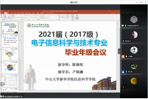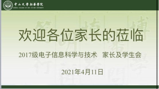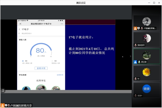 2021届高校毕业生总规模约为909万人,首次突破900万大关,今年的政府工作报告也指出“做好高校毕业生、退役军人、农民工等重点群体就业工作。”然而,受新型冠肺炎疫情和其他因素的影响,今年高校的就业形式相对较为严峻。因此,为了更好地帮助同学们就业,掌握更多的就业信息,提高员工们的就业能力,2021年4月11日(周日)晚上19:00通过腾讯会议APP准时召开了线上的家长会,这次家长会是针对2017级电子信息科学与技术专业(以下简称为“17电子”)家长和员工召开的。出席本次家长会的成员有:17电子专业主任魏爱香老师、17电子专业主任梁立容老师、17电子辅导员卢锦澜老师、17电子班主任陈锦煌老师、17电子的家长和员工们、共计90余人。