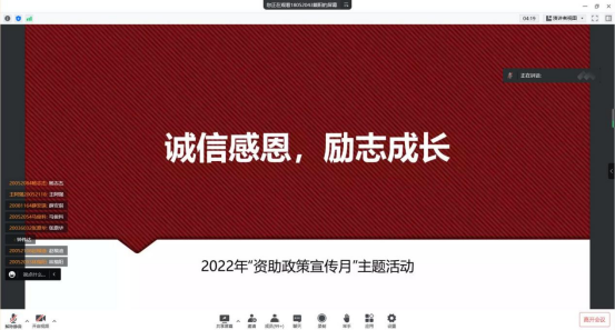 5月24日晚,2020级计算机科学与技术专业(以下称为“20计科”)在线上召开了“2022年‘资助政策宣传月’主题班会”。本次会议由吴嘉斓老师、戴阳同学、孙华强同学就“诚信感恩、励志成长”主题开展此次班会。