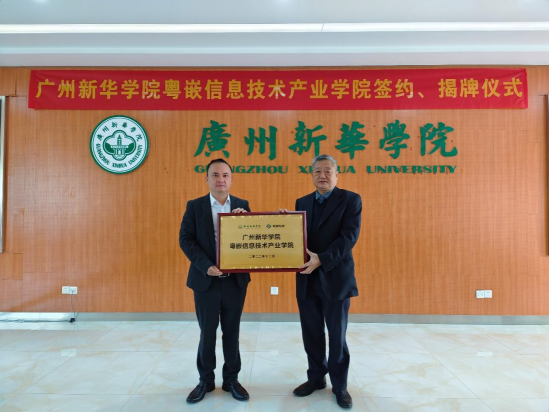在校企双方代表的见证下,王庭槐、钟锦辉签署共建合作协议,并举行了粤嵌信息技术产业公司揭牌和授牌仪式。