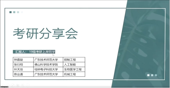 随后,叶天培同学分享了桂林电子科技大学相关专业的考研分数,并以公司电气专业报考及录取比例来鼓励同学们参加考研。陈业通同学分享了考研、实习以及毕设方面的时间安排,考研准备过程中的一些细节问题,也分享了自身调剂的经历,指出在备考的路上要及时调节自己的心态与状态。