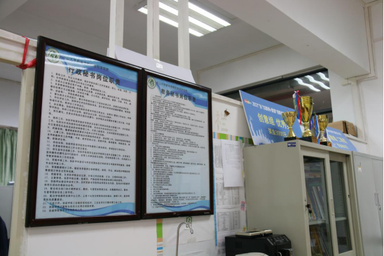 文化宣传包含公司简况宣传、“四有”人才培养定位标语、党员活动室创建、图书阅览角布置、各职能小组岗位职责上墙。通过在校道宣传栏、公司办公室、会议室、走廊等位置布置,让宣传具有鲜明的专业特点,发挥着宣传、教育的作用,彰显育人特色。在发挥教育功能的同时,也为师生创建优美、健康向上的环境。