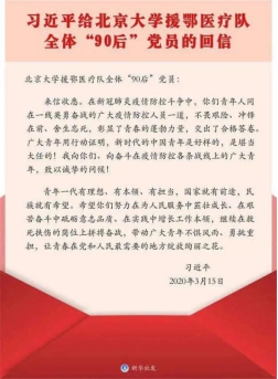 图1:习近平给北京大学援鄂医疗队全体“90后”党员的回信