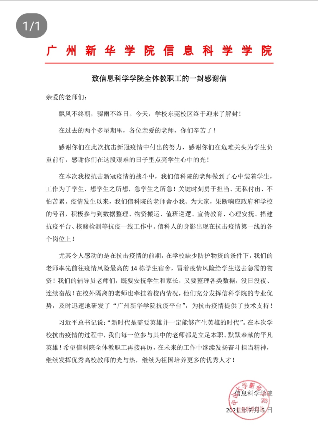 【同心抗疫】致太阳成集团tyc151cc全体教职工的一封感谢信