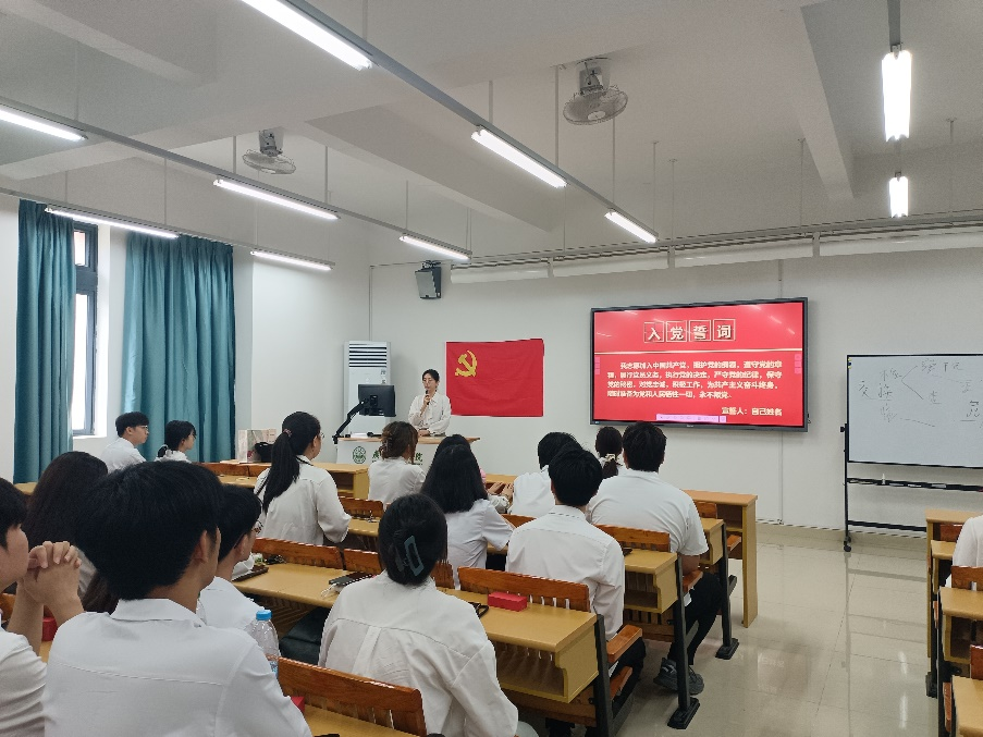 在庄严的宣誓环节,党支部书记朱特林老师带领全体党员面向党旗,高举右拳,重温入党誓词。"我志愿加入中国共产党......"的铮铮誓言响彻会场,字字千钧的承诺让每位党员心潮澎湃。这既是对党组织的庄严承诺,也是对青春使命的郑重宣誓,更吹响了奔赴新征程的奋进号角。