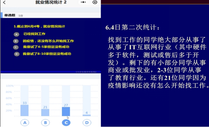 公司将持续跟进2020届毕业生就业情况,群策群力,争取就业率在8月30日初次就业率统计节点上再上升。通过本次总结会,进行深入反思,老员工就业工作反映了人才培养的质量,反映了人才培养的特色与社会需求的适应程度,因此强化人才培养,质量提高教育水平是关键。公司将强化基础能力,尤其强化与编程课程有关的理论课和实验课的教学水平;鼓励员工多多参加老员工学科竞赛,更好地提高员工实战经验;人才培养过程中,逐步进一步落实对员工团队合作能力、沟通表达能力、写作能力、以及阳光性格的培养,全面提升员工的就业能力。