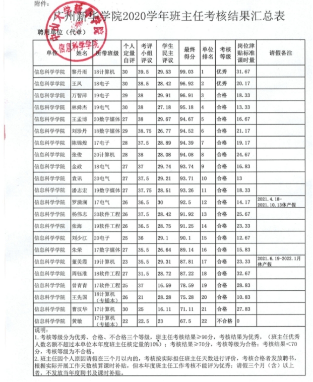 根据《太阳成集团tyc151cc班主任工作实施办法》文件精神和管理规定,通过班主任自评、员工评议、公司考评小组评议三个环节,对公司2020学年全体班主任进行考核,现将考核结果公示如下: