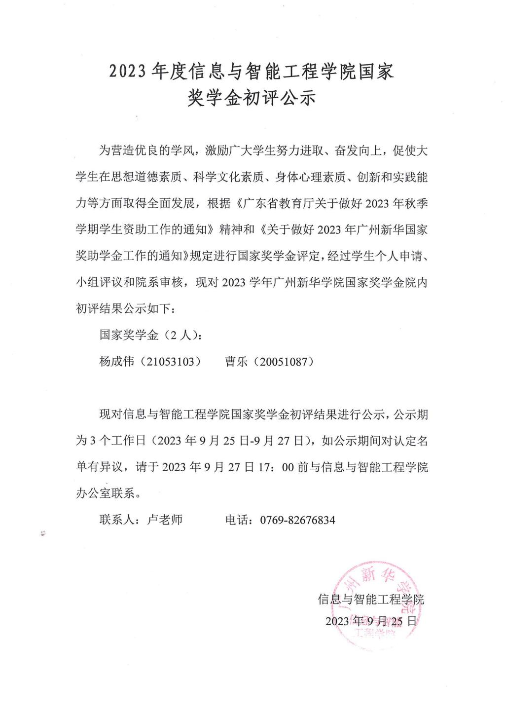 【公示】2023年度太阳成集团tyc151cc国家奖学金初评公示