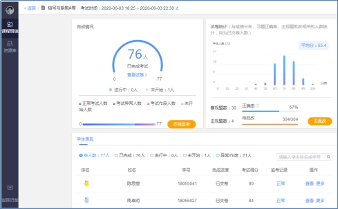 主观题批改完成后,考试数据就自动生成了,考试数据中详细标明了试卷名称、员工学号、姓名、得分、考试用时、交卷时间、客观题答案等。下载数据并保存,作为教务考试数据。