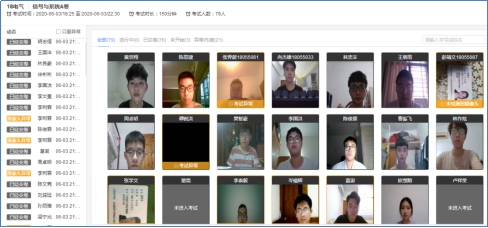 在监考页面中看到所有员工的考试状态,左侧动态按照时间倒序,标明了员工开始答题、考试异常、交卷、考试作废等状态。右侧显示员工列表,图片为其身份检验时拍摄的摄像头图像,考试异常或未检测到摄像头的同学将在列表中被标注出来,点击可进入员工个人页面。