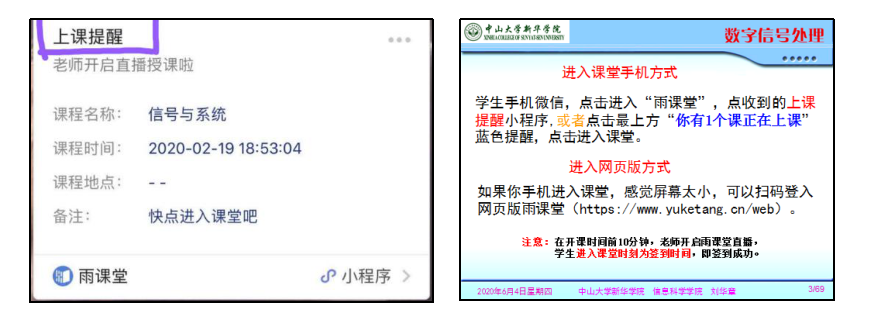 预备上课提示、员工接收到开启弹幕和语音直播通知