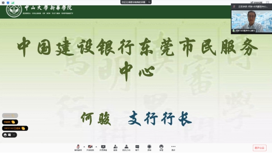 其次,中国建设银行东莞市民服务中心支行何骏行长围绕他自己的职业生涯发展进行了分享。他表示,学会聆听直属领导的讲话非常重要,强调作为一个新人为公司带来的应该是活力。他阐述到,在面对领导的要求时,听懂了领导的要求后便要积极踊跃的参与其中,大胆提出自己的想法,敢于表达。最后,他重点说到在工作中“一分表达,九分落实”。告诉同学们,作为单位领导更注重的是结果,而非过程。提醒同学们,做任何事情前要考虑其现实性和可操作性,最后才是实际的贯彻落实。