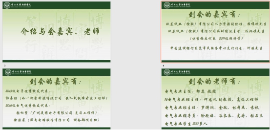 首先,为我们带来分享的是玖龙公司的赖伟杭经理,他通过一段视频介绍了玖龙集团的发展历程以及公司所秉承的“更少索取,更多贡献“持久共赢的环保发展理念。以”寻找脚踏实地“为主题,为同学们讲解了电气专业员工在公司中的成长历程、岗位需求与职责以及晋升通道等。谈到优秀员工在公司的发展时,重点表示公司是一个公平公正的竞争平台,更看重是源于个人的努力、主动性和钻研性,有积极向他人请教的态度。