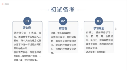 谢纯学姐着重讲述了初试备考的三个关键点:保持好心态、有定性和做好学习规划。
