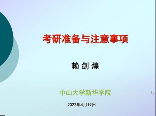 本次会议内容分为三个部分,首先由赖剑煌教授谈了考研准备与注意事项,其次是成功上岸的师兄师姐的经验分享,最后是会议总结。