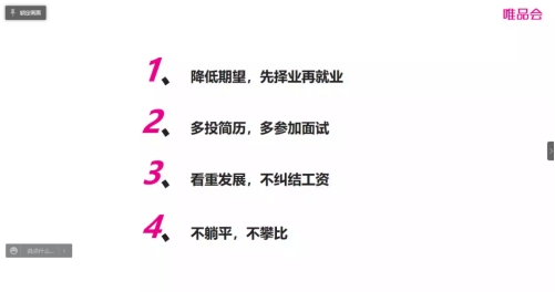 唯品会的韩总首先为大家解读了目前的就业大环境、列举了需求端和供给端的一些数据信息,让大家更清楚地看到和了解到目前的就业形势,接着向大家分享了自己的工作经历,最后也对大家的就业提出了一些建议。