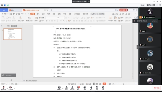 5月9日晚8点,2018级数字媒体技术专业(以下称为“数媒”)在线上召开了“2018数字媒体技术专业企业宣讲动员会议”。本次会议邀请了广州云图动漫股份有限公司、广州古藤动漫科技有限公司、广州漫游计算机科技有限公司以及深圳匠厂科技有限公司四家企业开展线上宣讲,同时邀请了16数媒李浩杰、17数媒冯鹏文、张旌桓三位往届毕业生分享就业经验。