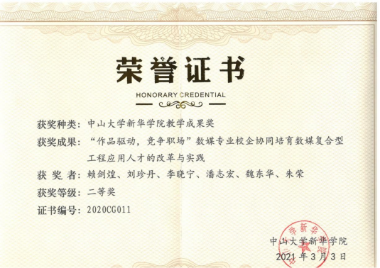 数媒在校企合作教学方面获得多项成果,2021年3月“作品驱动、竞争职场”数媒专业校企协同培育数媒复合型工程应用人才的改革与实践荣获中山大学新华公司教学成果奖二等奖。