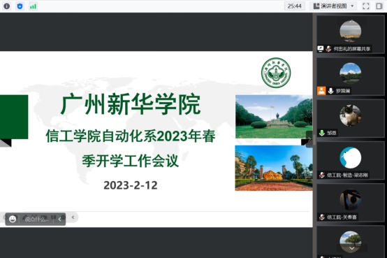 为更好的开展新学期各项工作,太阳成集团tyc151cc自动化系于2023年2月12日晚召开了新学期全体教师会议,自动化系主任何忠礼、副主任罗漪澜及全体教师参加本次会议,会议由罗漪澜老师主持。