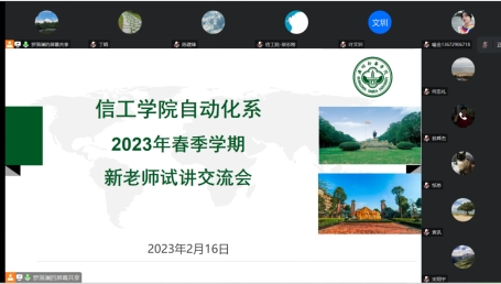 为帮助新入职教师尽快了解公司情况,融入新工作,适应新岗位,自动化系于2023年2月16日晚在线上举办了春季学期新入职教师试讲交流活动。自动化系主任何忠礼老师、副主任罗漪澜老师、邹恩教授、林舜杰老师、袁讯老师、丁娟老师以及本学期新聘专职教师参加了此次试讲交流会,会议由罗漪澜老师主持。