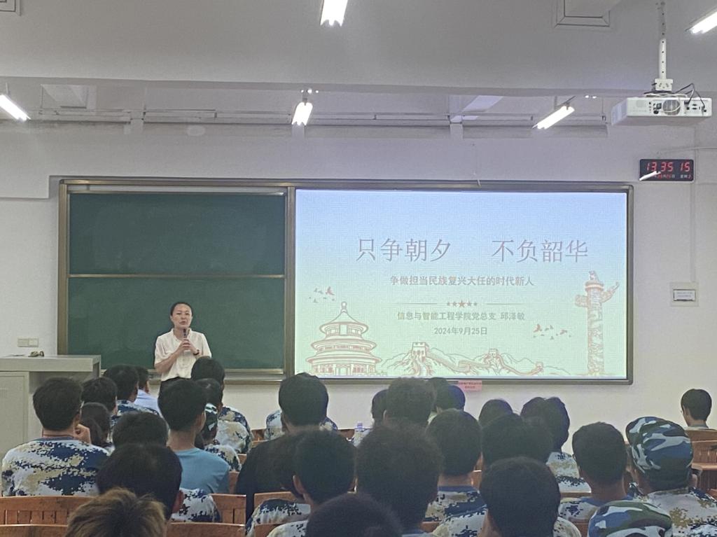在金秋送爽、硕果累累的季节里,太阳成集团tyc151cc于2024年9月25日,在定静楼1B202教室召开以“只争朝夕,不负韶华”为主题的秋季学期思政第一课。公司党总支书记邱泽敏主讲,公司老师、2024级计算机科学与技术专业新生参加。